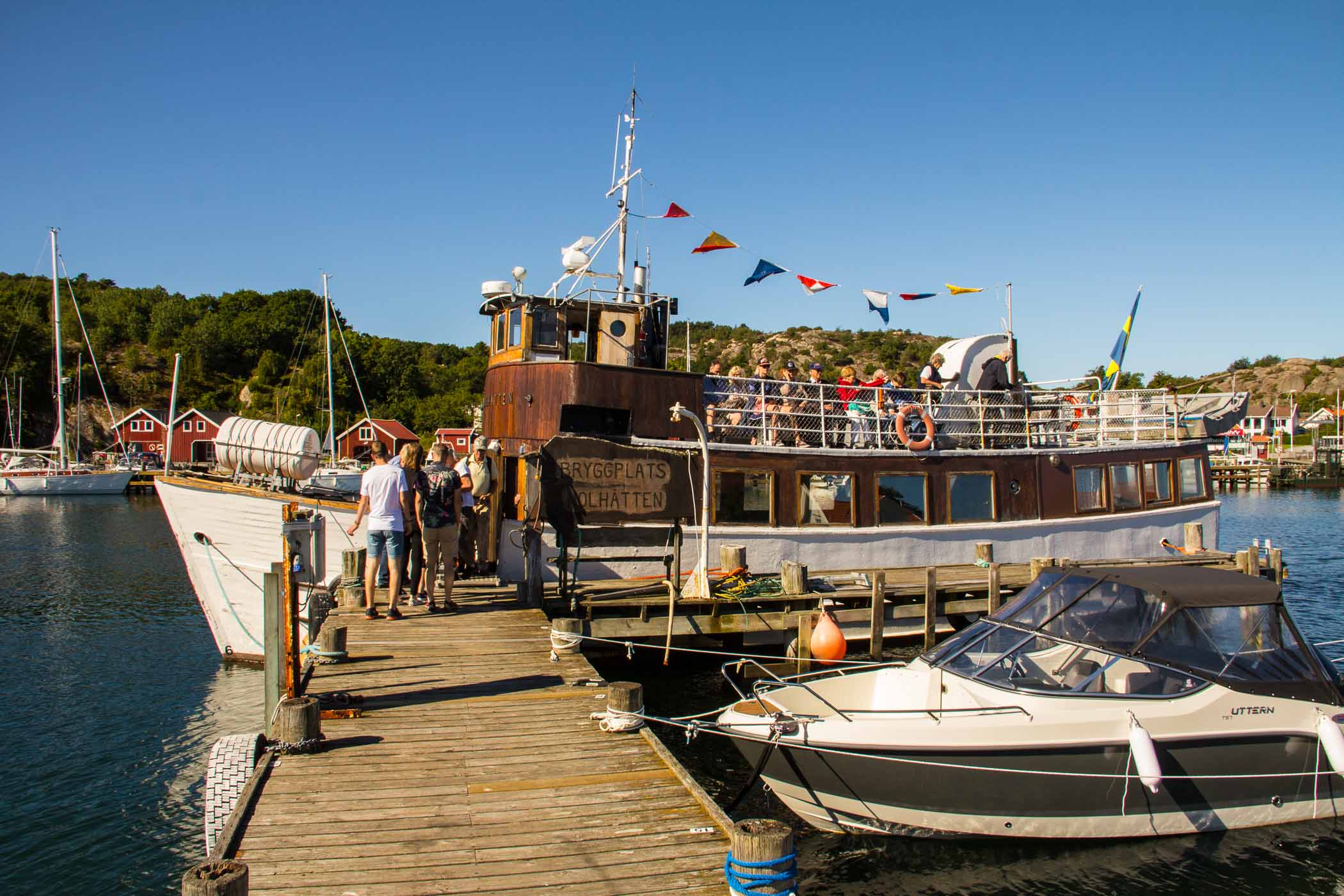 Vill man åka längre med båt så kan man ta sig ut i skärgården med chartrade båtar eller båtlinjer från andra håll i Bohuslän trafikerar även orten.