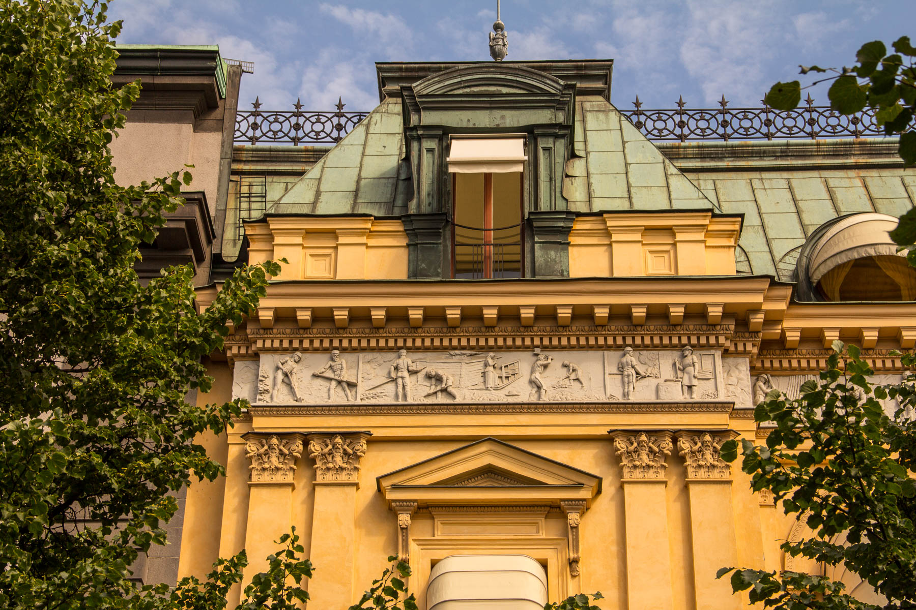Det är många som missar att man måste stå på andra sidan gatan och titta uppåt för att se den 57 meter långa bildfris som finns på Jernkontorets byggnad. 29 olika avbildningar finns att se, som skildrar den tekniska utvecklingen fram till mitten på 1800-talet.