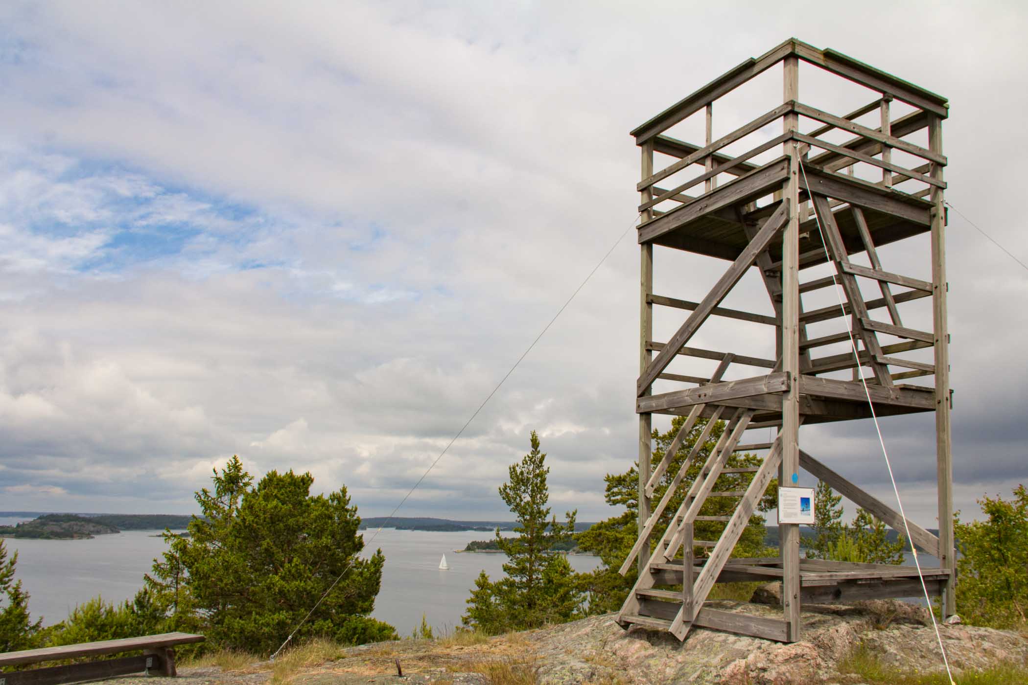 Från toppen där det finns ett utsiktstorn med fantastisk utsikt. Vid god sikt ser man från Globen i väster till Revengegrundet i öster.