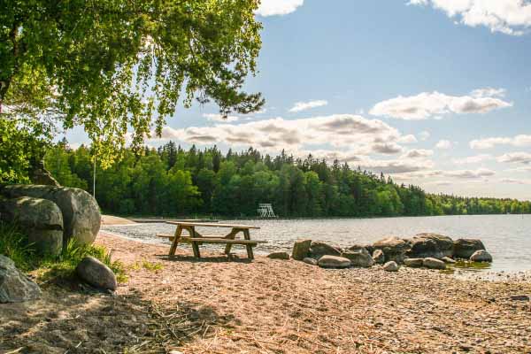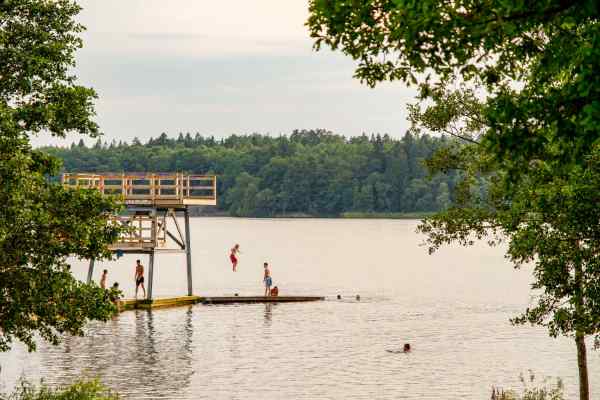 Flatenbadet är egentligen tre olika bad. Ett för de allra minsta, ett för yngre tonåringar och ett stort för alla åldrar. Här finns sandstränder, bryggor och hopptorn. Solar gör man på sand eller gräs. Kiosk och minigolf finns sommartid. För den rastlöse rekommenderas en promenad runt sjön som tar en knapp timme.