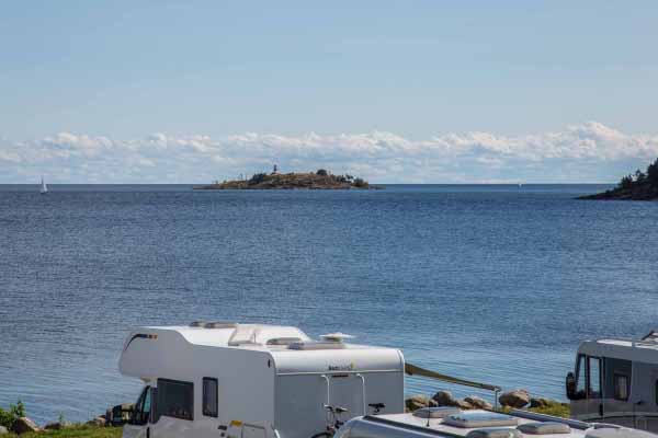Platsen är inte bara något för campare. Den vackra Vänerstranden har badplats och restaurang med fik. Det man saknar i komfort i en hyrstuga här uppvägs av läget.