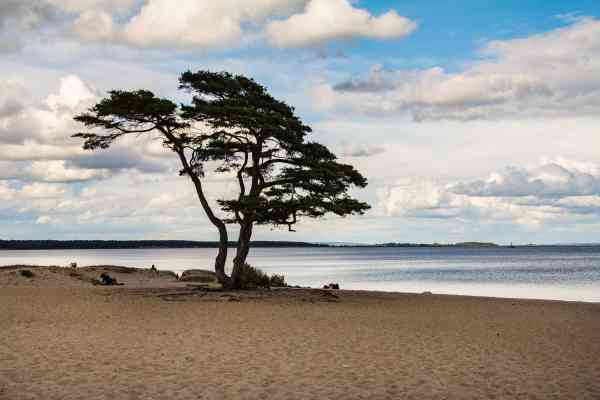 En jättepopulär badstrand vid Hanöbukten i Åhus med fik, krogar och tallen med den kända siluetten. Långgrunt och barnvänligt.