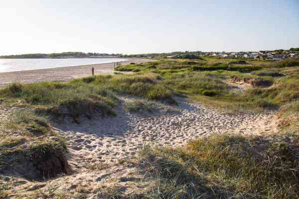 Ett av Västkustens bästa stränder. Ett strandliv som når höga höjder under högsäsongen. Smidigt biltåg från Varberg hit.