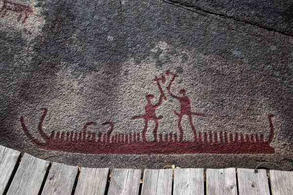 Stor del kan vara en ristares verk. Till skillnad från de flesta andra hällarna de aldrig nåtts av Bronsålderns hav, men här passerade vägen till Bullarebygden. Är en hällristning i Världsarvet.