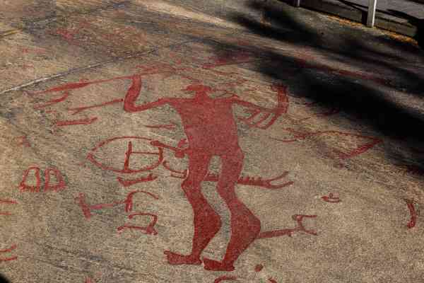 Hällen är mest känd för den 2,3 m långa ”Spjutguden” som faktiskt kan vara den yngsta ristningen och kan föreställa Oden. Järnåldersbåtar och en strid till häst är andra höjdpunkter.