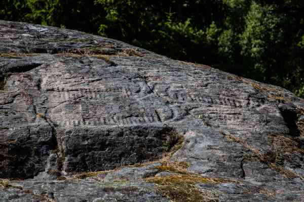 Efter en c:a en km lång vandring når man en av Sveriges märkligaste och intressantaste hällristningar. Det är också en av de största med bland annat 150 inristade skepp.