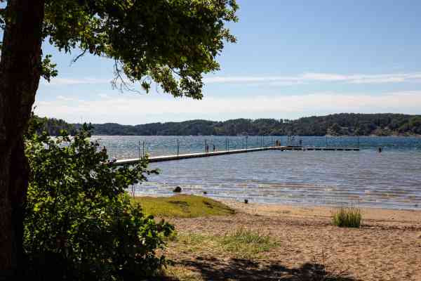 Denna badplats är majestätiskt skyddad av höga klippor. En kort promenad leder till en utsiktsplats på ett gammalt vårdkaseberg. Bryggor, hopptorn, sandstrand, toa och dusch.